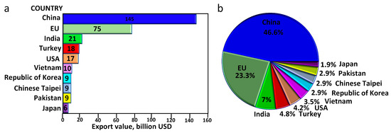 Currently, azo dyes represent more than 60% of total global dye production. Due to their relatively low price, high availability, possibility of obtaining a wide range of colors, and high dyeing power, they represent the largest group of dyes used in industry applications [1,2,3]. The industry sectors using azo dyes are mainly the leather, printing, cosmetics, and food (coloring of sweets, jams, jellies, and ice creams) industries. However, the largest consumer of azo dyes is the textile industry [1,4]. The worldwide production of the textile industry reached USD 322 billion in the last year. Among countries that comprise the top textile exporters are China and India (see Figure 1), accounting for over 52% of global exports. The textile industry uses pigments, among which 65–75% are based on azo dyes [5]. Azo dyes are aromatic compounds containing in their structure nitrogen atoms connected by a double bond (AR-N=N-AR) [6].