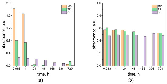 The change in the absorbance value coming from MO, TR, and CL and ascorbic acid at the λ characteristic for the respective dyes (510 nm for MO; 460 nm for TR, and 530 nm for CL) (a) and at 264 nm after 10,000 dilutions (b) at different times. Conditions: mascorbic acid = 0.4 g, C0, MO, TR, CL = 5 × 10−5 mol/dm3 (the value of concentration before mixing), T = 20 °C, and path length of 1 cm. Please note that MO data were not collected after 48, 168, and 336 h or for TR after 168 and 336 h.