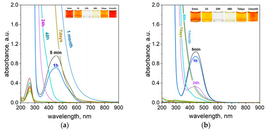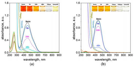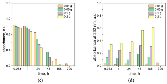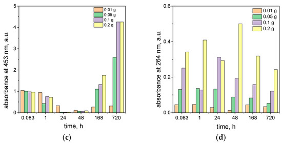 The degradation of MO for the concentration of 0.2 g ascorbic acid came after 1 h (see Supplementary Materials, Figure S14a–d). However, for the lowest concentration of ascorbic acid (0.1 g–0.01 g), the color disappeared after 24 h (see Supplementary Materials, Figure S14b–d). The characteristic UV-Vis spectra were recorded with maximums for different amounts of ascorbic acid: 506 nm for 0.2 g (see Supplementary Materials, Figure S14a), 450 nm for 0.1 g (see Supplementary Materials, Figure S14b), 447 nm for 0.05 g (see Supplementary Materials, Figure S14c), and 443 nm for 0.01 g (see Supplementary Materials, Figure S14d) of ascorbic acid. As for MO, the intensity of the spectrum decreases in a short time (see Supplementary Materials, Figure S14e). For MO, similar to TR, the solutions turn yellow after 7 days. Then, they turn brown, orange, or yellow after one month, depending on the concentration of ascorbic acid. After ten thousand dilutions, the maximum (264 nm) coming from ascorbic acid was registered (see Figure 7d and Supplementary Materials, Figure S14f). Further changes in the absorbance intensity relate to the activity of ascorbic acid and other products’ appearance.
