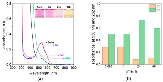 The process of MO removal was faster than for TR, and the intense red color coming from methyl orange disappears after 24 h (see Figure 4a, Supplementary Materials, Figure S4a). The fading of the color was accompanied by a change in the UV-Vis spectrum as shown in Figure 4a and Supplementary Materials, Figure S4a. The characteristic maximum at 510 nm decreases over time (Supplementary Materials, Figure S4a). The process of MO and TR degradation occurs relatively faster than for the solution containing calcon. In the case of CL, the pink color coming from the dye disappears 1 month later (see Supplementary Materials, Figure S4b). For this dye, the registered spectrum has one maximum localized at a wavelength of about 530 nm, and its intensity decreases over time (see Figure 4a and Supplementary Materials, Figure S4b). The solutions containing MO and CL were also diluted to record the ascorbic acid spectrum. The appearance peak at 264 nm indicates the presence of a dissociated form of ascorbic acid in the solution. The MO samples were analyzed after 1 month. Similar to the previous observation (TR, Figure 3a), the samples appear pale yellow in color (see Supplementary Materials, Figure S4a). The small absorbance increases after a long time (i.e., 720 h), and it comes from oxidized products of ascorbic acid. The presence of these compounds in the solution starts to absorb light at 550 nm for the MO solution (see Figure S4a, Supplementary Materials). The graph shown in Figure 4b also suggests that the value of ascorbic acid slightly changes with time (see Figure 4b). However, we need to take into account a large dilution of the sample, in which small changes are a huge change in absorbance intensity.