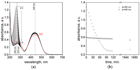 The UV-Vis spectra evolution (2 h, step of 5 min) of the solution containing the mixture of tropaeolin OO and ascorbic acid at 50 °C (a); Kinetic curves registered at 262 and 440 nm (b). Conditions: volumetric ratio of TR to ascorbic acid (1:1); the value of the concentration of tropaeolin OO after mixing with ascorbic acid: TR = 5 × 10−5 mol/dm3, and ascorbic acid = 2 × 10−4 mol/dm3.