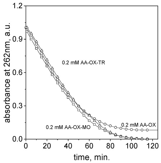 Kinetic curves registered at 50 °C for solutions containing ascorbic acid (AA-OX); ascorbic acid and MO (AA-MO); and ascorbic acid and TR (AA-TR). Conditions: volumetric ratio: 2 mL azo dyes (or water, sample AA-OX), 2 mL ascorbic acid, C0, Azo-dyes = 5 × 10−5 mol/dm3, and C0, ascorbic acid = 2 × 10−4 mol/dm3. Note: the values of absorbance were manipulated for AA-MO and AA-TR in such a way that the value of absorbance at 262 nm was reduced by absorbance value derived from dye (0.235 for MO and 0.285 for TR).