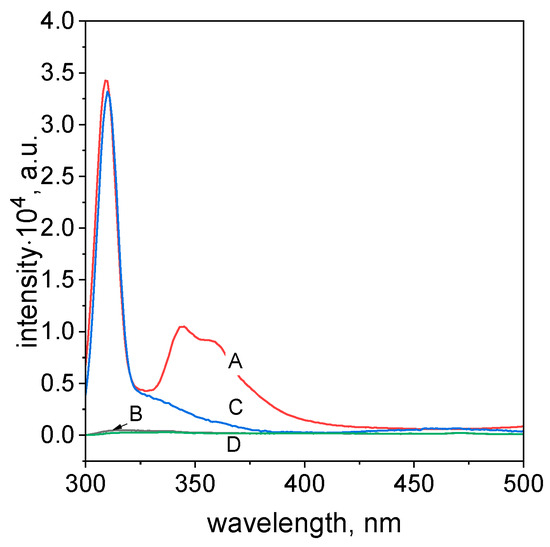 The fluorescence spectra with excitation wavelength at 280 nm obtained for ascorbic acid, tropaeolin OO, and their mixture after 5 and 60 min. Conditions: C0,TR= 5 × 10−5 mol/dm3 (the value of concentration before mixing), mascorbic acid = 0.2 g, and T = 50 °C. Notation: A—TR solution; B—ascorbic acid solution; C—mixture of TR and ascorbic acid, 5 min later; and D—mixture of TR and ascorbic acid, 1 h later.