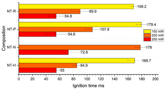 All tested compositions showed tunable relation between radiation power and ignition time. With decreasing radiation power, a fast increase in ignition time is observed. This is significant enough that for radiation powers of 150 mW (for NT-N) and 100 mW (other samples), no ignition is observed. For the highest utilised irradiation power (250 mW), the ignition time was very similar for all tested NSTEX samples (variation of up to 10 ms). Irradiation with 200 mW resulted in the ignition times becoming more visibly dependent on the type of sample. The longest ignition times were achieved for NT-N for all utilised radiation powers. This likely stems from the properties of the EM that was used as the additive, i.e. its high critical diameter, low reactivity in comparison with other EMs and high decomposition temperature.