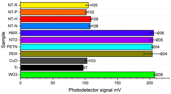 The reflected light intensity is relatively high for the tested EMs, with the individual compounds differing only slightly. Moreover, the signal of the photodetector shows (Figure 2) that the reflected light intensity of EMs was slightly lower than that of the tungsten(VI) oxide, which was part of the control group. This indicated that the EM crystals had poor laser absorption. This is due to the fact that organic compounds have significant absorption coefficients in the mid-infrared region (2.5–25 μm), which contains the main bands of their vibrational spectra [26]. In contrast, Ti and CuO were found to reflect much less light, which showed that these materials had a stronger laser absorption capacity than the EM crystals. Similar photodetector signals were obtained for the tested NSTEX samples. Moreover, the compositions have similar laser absorption capacity with respect to CuO, which is related to the morphology of the samples and the higher mass proportion of Ti and CuO than EMs in the sample.