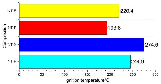 The friction sensitivity results point to more complex dependencies. In the case of NT-H and NT-N a fairly significant increase in measured value is seen. This effect results from the presence of solid components characterised by high hardness (in comparison to EMs) and the morphology of the prepared compositions, as discussed in the SEM section. Also, the catalytic effect of nano-CuO and nano-TiO2 (present as an oxide layer on the surface of the fuel particles) on the decomposition process of EMs should also be taken into account [28,29]. Conversely, for NT-P and NT-R the effect is opposite, which stems both from ultrafine EMs particle size, as the decrease in the particle size of EMs leads to lower sensitivity towards mechanical stimuli [30] and good component distribution as well.