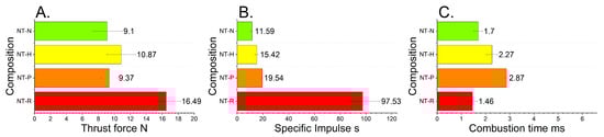 The maximum thrust force (A), specific impulse (B) and combustion time (C) of tested compositions.