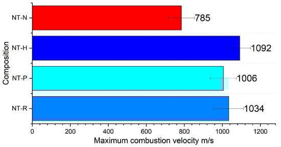 Taking into account all tested compositions, it can be seen that they showed similar behaviour (Figure 5). After ignition, the combustion process undergoes rapid acceleration up to fairly stable maximum combustion velocity (Figure A13). The similar maximum combustion velocities for PETN, RDX and HMX-based NSTEX indicates the slight impact of the EM in the composition on this parameter. Nevertheless, the significantly lower value for NT-N composition most likely results from NTO exhibiting a higher critical diameter than the other used EMs [36]. The effect of EM choice will be more pronounced if a higher EM content in relation to nanothermite is employed.
