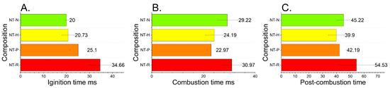 The post-combustion stage is the longest for NT-N compositions, yet a rather large measurement error must be taken into account. Whereas there is an apparent shortening of the post-combustion time for NT-P compared to the rest of the samples. Analysing all phases of combustion, it was found that the addition of NTO to nanothermites slows the ignition and combustion development of the tested compositions (Figure 9).