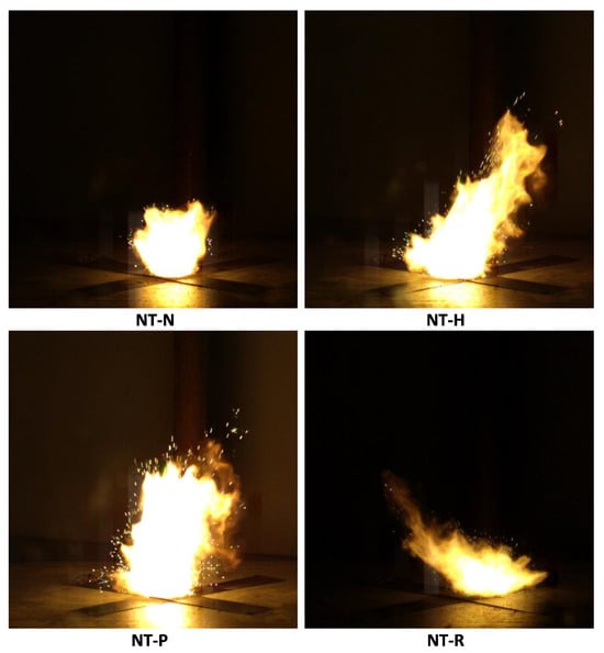 The highest ignition time was recorded for the NT-N composition. For the rest of the samples tested, the ignition times are fairly similar to each other. The results of open-air tests are in line with laser sensitivity tests, and the fairly constant ignition time for all compositions except for NT-N with much lower radiation sensitivity. The small differences may result from the methodology of the test, in which the tested material is poured without any cover onto the ceramic plate and ignited. Therefore, the different geometry of the sample between tests may affect results. The duration of the main stage of combustion is the shortest for the NT-H composition and the longest for the NT-N composition. In the case of the NT-R sample, despite achieving the shortest ignition time, the duration of the main phase is longer compared to NT-P and NT-H. The combustion process becomes more rapid for samples containing HMX and PETN (Figure 8). The development of the process is faster and more sparks can be seen. This is associated with the formation of a large amount of gaseous products that cause the acceleration of the combustion process. In the case of compositions containing RDX and NTO, a lower number of sparks can be observed in the main combustion stage. This indicates that most of the combustion reactions occurred inside the flame zone, and the scale of solid phase reactions increased.