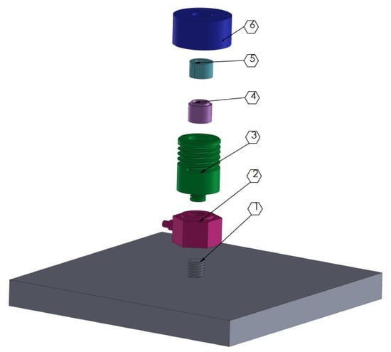 Scheme of thrust measurement set-up, where: 1—steel base, 2—force sensor, 3—threaded connector, 4—shell, 5—nozzle, 6—locking nut.