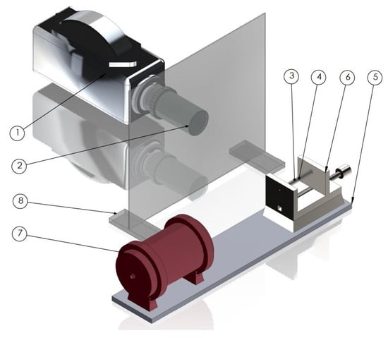 Scheme of open-air test set-up, where 1—high-speed camera; 2—optical lens, 3—PMMA tube, 4—nanothermite sample, 5—basic plate, 6—mounting plates, 7—optical collimator, 8—PMMA shelter.