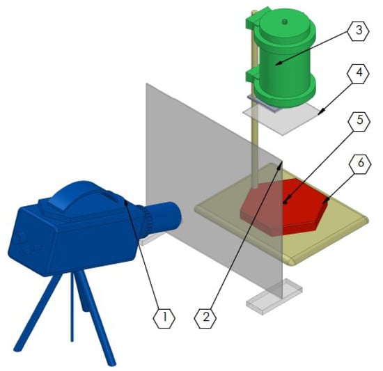 Scheme of open-air test set-up, where 1—high-speed camera; 2—PMMA shelter, 3—optical collimator, 4—PMMA shelter, 5—tested sample, 6—basic plate.