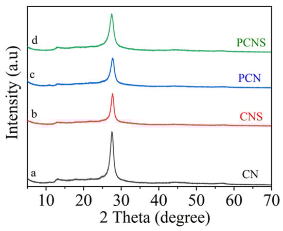 The synthesized materials were investigated by X-ray diffraction (XRD) to measure their crystal phases and compositions. As shown in Figure 1a, the diffraction peaks located at 13° and 27° were ascribed to the (100) and (002) crystal planes [22], respectively. The former (100) plane was ascribed to the in-plane structure stacking pattern [23], while the latter (002) plane corresponded to the interlayer stacking [24,25]. Through the thermal exfoliation reaction process, the CNS photocatalyst maintained the original structure of the bulk g-C3N4 (Figure 1b). Compared with g-C3N4, the intensities of the two peaks of PCN were reduced. The diffraction peak in the (002) plane was slightly shifted to a small angle (Figure 1c). The reduction in the diffraction angle revealed the increased (002) interplane distance, which was ascribed to the radius of P being much bigger than that of C or N. As presented in Figure 1d, the PCNS sample maintained the original structure of the bulk g-C3N4. Meanwhile, the characteristic peak intensity became weaker and broader.