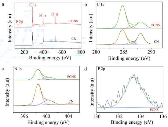 The chemical states and compositions of g-C3N4 and the PCNS were studied by XPS. The XPS survey spectra in Figure 3a reveal that the two samples contained C and N elements. Moreover, the element of P was observed in the PCNS. As presented in Figure 3b, it can be observed that g-C3N4 exhibited three typical C 1s peaks located at 284.78, 286.38, and 288.08 eV, attributed to the physically absorbed carbon species or sp2 C–C bonds, C–NH2 species, and sp2–bond carbon (N–C=N) in the g-C3N4 aromatic ring [26]. The high-resolution spectrum of N 1s in g-C3N4 was divided into three peaks located at 398.48, 400.38, and 404.28, eV. The peak centered at 398.48 eV was attributed to the sp2-hybridized nitrogen (C–N=C group) [27,28]. The peak located at 400.38 eV was assigned to the tertiary N (C3–N or C2–N–H) [29,30]. The peak at 404.28 eV was related to the amino functional group (C–N–H) [8,31,32,33]. Compared with pristine g-C3N4, the C 1s and N 1s spectra of the PCNS were downshifted to low binding energies, which was ascribed to the P-doped change in the surface charge distribution. In addition, the characteristic peak of P 2p at 133.38 eV corresponded to the P–N bond in the PCNS [34,35,36,37].