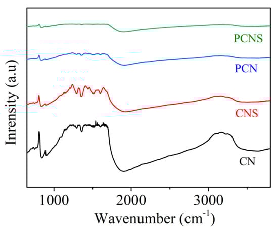 To gain insight into their molecular structures, all the photocatalysts were investigated by FTIR. As presented in Figure 4, the peak located at 810 cm−1 was assigned to the out-of-plane bending mode of the heptazine units [38]. The peak in the range of 880–1640 cm−1 could correspond to the N–C=N heteroaromatic rings [39,40,41]. A characteristic peak for the aromatic C–N and C=N stretching vibrational model was shown at 1200–1700 cm−1 [42]. The peak centered at 3160–3440 cm−1 was attributed to the N–H stretching vibrations [43,44,45]. After the P-doping and thermal exfoliation reaction processes, the CNS, PCN, and PCNS photocatalysts maintained the original molecular structure of g-C3N4.
