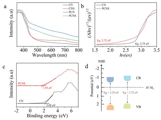 The optical properties of all samples were measured by UV–vis absorption spectroscopy. As displayed in Figure 5a, the absorption edge of g-C3N4 was mainly located at 460 nm. In comparison, the absorption of CNS exhibited an obvious blueshift, which was ascribed to the quantum size effect. After P doping, the PCN sample absorption band edge had a minor redshift, expanding to the visible-light region. After the thermal exfoliation reaction process, the PCNS featured a blueshift, which corresponded to the quantum size effect. In addition, according to the Tauc method, the band gaps of g-C3N4 and the PCNS were 2.72 and 2.75 eV, respectively. As presented in Figure 5c, the VB potentials of g-C3N4 and the PCNS were 2.05 and 1.95 eV, respectively. Thus, the VB values of g-C3N4 and the PCNS were calculated to be 2.15 and 2.05 eV, respectively, according to the following equation: