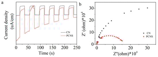 Photoelectrochemical analysis was conducted to gain further insight into the charge separation and transfer efficiency. Figure 6a presents the periodic on/off photocurrent responses of the CN and PCNS electrodes at 0.2 V (vs. Ag/AgCl) with a 1.0 M Na2SO4 electrolyte under visible-light illumination (λ > 420 nm). The photocurrent density of the PCNS was higher than that of CN, indicating the fast separation and transfer efficiency of the photogenerated electron–hole pairs after the P-doping and thermal exfoliation strategies.