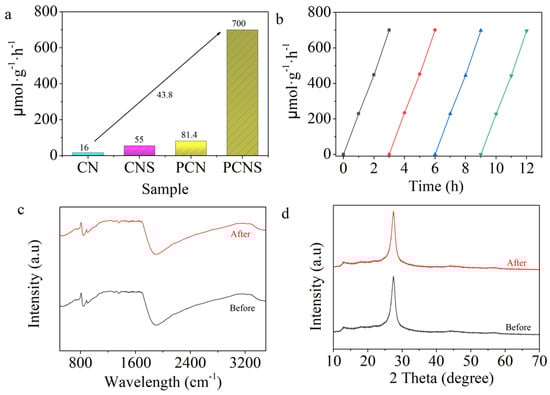 The photocatalytic activity of all samples was tested under visible-light irradiation using 100 mL of an aqueous solution containing 10% TEOA as a sacrificial agent. No hydrogen gas was detected without irradiation or a photocatalyst. As depicted in Figure 7a, the hydrogen evolution rate of pristine g-C3N4 was negligible (16 μmol·g−1·h−1). Then, after the thermal exfoliation reaction process, the CNS exhibited a high value of 55 μmol·g−1·h−1. After P doping, PCN showed that its photocatalytic performance was 81.4 μmol·g−1·h−1, which was 5.1 and 1.5 times higher than that of g-C3N4 and CNS. Meanwhile, the PCNS exhibited a high photocatalytic activity of 700 μmol·g−1·h−1, which was 43.8 times higher than that of CN. To further prove that the P-doping and thermal exfoliation reaction processes can enhance the photocatalytic performance of g-C3N4, comparisons between the photocatalytic abilities of the photocatalysts in the related reports and the as-prepared photocatalysts are listed in Table S1. Our work exhibited an improved H2 evolution rate compared with other reported photocatalysts. The remarkable photocatalytic performance of the PCNS was ascribed to its higher surface area affording more reactive sites. In addition, the AQE reached 0.49% under 420 nm light irradiation for the PCNS. Photostability is an important parameter for a photocatalyst’s application. As depicted in Figure 7b, the H2 evolution rate almost kept the same value during the four-cycle reaction, revealing excellent photocatalytic stability. Moreover, the XRD and FTIR patterns of the PCNS before and after the reaction did not change, confirming the favorable stability of the PCNS (Figure 7c,d).