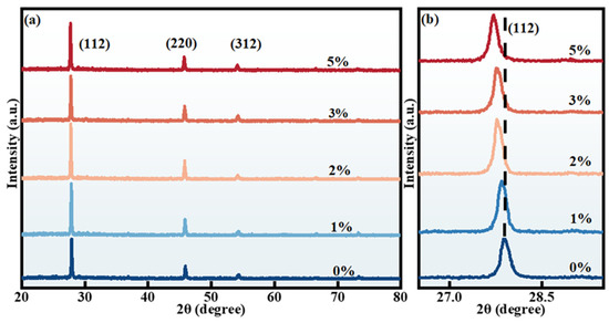 Firstly, XRD data of RCZTSSe thin films with diverse Rb-doping content were analyzed. The results are shown in Figure 1a. In the following, for convenience of description, Rb-0%, Rb-1%, Rb-2%, Rb-3%, and Rb-5% were used to represent the un-doped sample and the doped samples with 1%, 2%, 3%, and 5% of Rb-doping content, respectively. XRD diffraction peaks of all films were located at 27.20°, 45.26°, and 53.39°, corresponding to (112), (220), and (312) crystallographic planes of CZTSSe, respectively [25]. Besides the three peaks above, other diffraction peaks of copper-, zinc-, selenium-, and rubidium-related complexes were not observed, indicating that Rb atoms entered the crystal lattice in the form of replacing Cu atoms or gap atoms, and no impurity phase was formed on the film surface. Figure 1b shows the corresponding enlarged image of the (112) diffraction peaks. When the Rb-doping content increased from 0% to 5%, the diffraction peak moved towards a smaller angle. The reason was that the Rb+ ion’s radius (1.52 Å) surpassed that of the Cu+ ion (0.77 Å), and the replacement of Cu+ by Rb+ ion was the cause of the expansion of the volume of a single crystal cell.