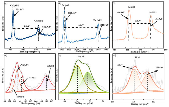 Subsequently, to ascertain the valence states of Cu, Zn, Sn, S, Se, and Rb in RCZTSSe, we employed XPS measurements, illustrated in Figure 5. After cation replacement, the valence states of Cu(+1) and Zn(+2) can be determined from the peak positions and energy differences in the Cu 2p and Zn 2p spectra shown in Figure 5a,b [32,33]. The XPS spectrum of Sn 3d is depicted in Figure 5c. Two independent peaks situated at 486.3 eV and 494.7 eV were consistent with the core energy levels of Sn 3d5/2 and Sn 3d3/2, respectively. This suggests that Sn is in a +4 valence state [34]. Since the fitting curve of S 2p nearly overlapped with that of Se 3p, the S 2p XPS spectrum was acquired using Gaussian fitting techniques, as shown in Figure 5d. These characteristic peaks obtained after fitting were matched with Se 2p3/2, S 2p3/2, S 2p1/2, and Se 3p1/2. The peak values of S 2p3/2 and S 2p1/2 were 160.5 eV and 161.3 eV, respectively, within the established range of standard values for S in sulfide compounds. Consequently, it was deduced that S was present as S2− in RCZTSSe [35]. Figure 5e shows that the peaks of Se 3d3/2 and Se 3d1/2, identified using the Gauss-Lorentz fitting technique, were positioned at 54.8 and 54.0 eV, respectively. This indicates that Se ions were present in the form of Se2− in RCZTSSe [36]. Figure 5f also shows the existence of Rb in the film. Rb 3d peaks were recorded at 110 eV and 110.4 eV, and its binding energy was nearly equivalent to that of Rb+. It indicated that the valence state of Rb was +1 [37]. Therefore, the XPS results showed that Rb was successfully doped into CZTSSe, and the composition elements of RCZTSSe film samples were obtained in the chemical valence states of Cu+, Zn2+, Sn4+, S2−, Se2−, and Rb+1.