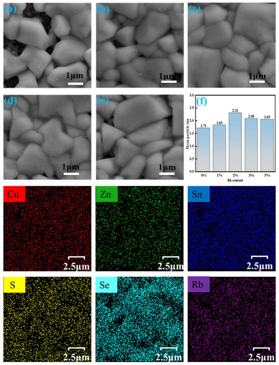 SEM images of RCZTSSe films with various Rb contents: (a) Rb-0%, (b) Rb-1%, (c) Rb-2%, (d) Rb-2%, and (e) Rb-5%. (f) The average grain dimensions in the films. EDS mapping images of Cu, Zn, Sn, S, Se, and Rb elements in the Rb-2% thin film.