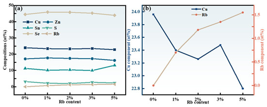 Figure 7a displays the EDS outcomes of the RCZTSSe films, also shown in Table 1. The findings indicate that with an increasing Rb doping ratio, the content of other elements except Cu in the film were finally actually unchanged. Figure 7b demonstrates that the proportion of Cu atoms decreased when the content of Rb gradually increased. The above results indicate that Rb doped into the CZTSSe lattice by substituting the partial Cu atom.