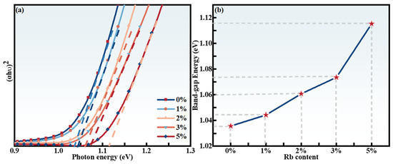 To obtain the value of Eg, the linear part of the curve (αhυ)2 was projected onto the X-axis (i.e., (αhυ)2 = 0, Eg = hυ). As shown in Figure 8b, the Eg values of RCZTSSe films with various Rb contents (Rb-0%, Rb-1%, Rb-2%, Rb-3%, and Rb-5%) were 1.03, 1.04, 1.06, 1.07, and 1.11 eV, respectively. The RCZTSSe thin films’ bandgaps increased with increasing Rb-doping content. This shows that Rb doping could obtain continuously tunable Eg. The bandgap value refers to the variance in energy between the valence band maximum (VBM) and the conduction band minimum (CBM) (i.e., CBM = VBM + Eg) [46]. Based on the first-principles calculations, for RCZTSSe films, the hybridization of Cu 3d and anionic S 3p (Se 4p) orbitals control the VBM. The position of the CBM is ascertained by the hybridization of the Sn 5s and S 3p (Se 4p) orbitals. As reported in some articles, the stronger hybridization between the Cu 3d and S 3p states can push the VBM upward [47,48]. However, this stronger hybridization is weakened when part of Cu+1 is replaced by Rb+1. In other words, the VBM tends to decline with the doping of Rb. Replacing Cu with Rb results in a decrease in the VBM, and the CBM remains invariable, thus, the bandgap of the absorption layer in RCZTSSe film can be modified through the regulation of Rb-doping content. According to literature reports, an absorbing layer with a large bandgap is expected to provide high Voc and device performance because it can suppress recombination at the heterojunction interface [49,50]. Therefore, we believe that Rb doping has a beneficial impact on improving the performance of CZTSSe films.