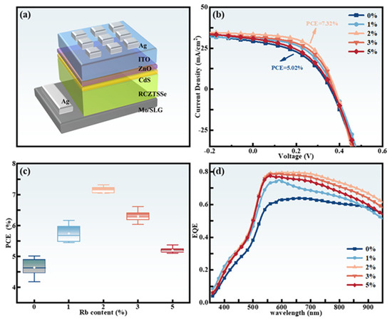 To understand the influence of Rb doping on the performance of CZTSSe solar cells, devices with a Ag/ITO/i-ZnO/CdS/RCZTSSe/Mo/SLG structure were prepared, as shown in Figure 9a. RCZTSSe solar cells with varying Rb-doping content were adopted for analysis in detail under simulated AM 1.5 sunshine. Figure 9b displays the J–V curves of the five devices, from which their photovoltaic and electrical characteristics were derived, as showed in Table 3. The J–V curve shows that the device with 2% Rb content exhibited superior photovoltaic characteristics. The maximum PCE of 7.32% was attained by the champion photovoltaic device. Table 3 indicates that, compared to those of the CZTSSe device, the Voc, Jsc, and fill factor (FF) of all RCZTSSe solar cells showed substantial improvements. On the one hand, the increase in Voc might have stemmed from the reduction of CuZn defects and [2CuZn + SnZn] defects from Rb doping, easing the intense band tail states [53]. On the other hand, substituting Cu with Rb might have enabled an adjustment of the valence band edge, causing better alignment of bands between the absorbing and buffer layers, thereby lessening the Voc losses induced by interface mismatch [48,54]. The increase of grain dimensions and crystallinity of the absorbing layer is the reason for the improvement in Jsc and FF [55]. According to Table 3, with an increase in the Rb-doping content from 0% to 5%, the series resistance (Rs) diminished initially, followed by an increase. However, the variation trend of the shunt resistance (Rsh) was contrary to that of Rs. The minimum value of Rs was 12.66 Ω·cm2, and the maximum value of Rsh was 690.58 Ω·cm2 when the content of Rb was 2%. We know that diminishing the number of holes in the RCTSSe absorption layer and an improvement of film smoothness have a positive impact on the RCTSSe/CdS interface, which can suppress the recombination of photogenerated carriers, thereby lessening Rs [56]. Moreover, the increased Rsh was due to CuZn and [2CuZn + SnZn] defects being suppressed by Rb doping and inhibited shunt effect. Therefore, the changes in Rs and Rsh contributed to the further optimization of Jsc and FF.