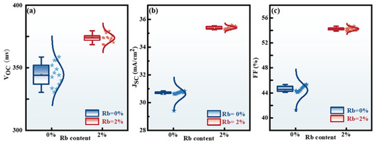 Statistical box diagrams of performance parameters of Rb-0% and Rb-2% devices: (a) Voc, (b) Jsc, and (c) FF.