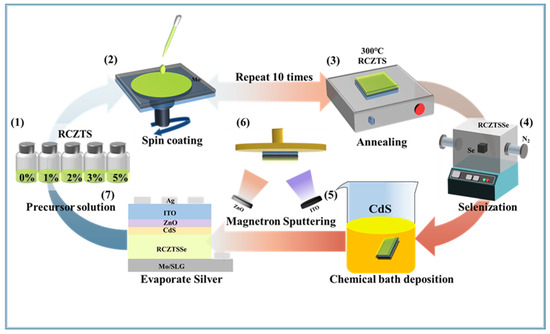 Schematic drawing of the preparation process of an RCZTSSe solar cell. (1) Preparing an RCZTS precursor solution with different Rb-doping content; (2) spin-coating the precursor solution; (3) annealing the RCZTS thin film; (4) selenization in a N2 atmosphere; (5) preparing a CdS layer by chemical bath deposition; (6) preparing ZnO and ITO layers by magnetron sputtering; (7) preparing a silver electrode.