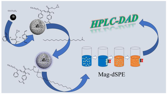 At present, the detection methods of food additives include liquid chromatography [18,19,20,21,22], gas chromatography [23], and colorimetric methods [24]. However, the composition of the sample is very complex, and the sample needs to be pretreated before the instrument detection. Solid phase extraction (SPE) is the most widely used pretreatment technique. It includes solid phase microextraction (SPME), dispersed-solid phase extraction (d-SPE) [25], and molecularly imprinted solid phase extraction (MISPE) [26,27,28]. SPE minimizes matrix effects, improves selectivity and recovery, and the detection limit of the instrument is greatly reduced [29]. In 2022, a novel molecularly imprinted polymer was used as an adsorbent for MISPE to remove sodium saccharin from the sample. The detection limit was 7.0 g/L [30]. SPE is more efficient and flexible than liquid–liquid extraction in terms of flexibility, simplicity, and low consumption of organic solvents. Still, the solid–liquid separation time is long after the target is adsorbed by the adsorbent. Therefore, an obvious trend in analytical chemistry is to shorten the separation time. To solve this problem, a simple and efficient magnetic dispersive solid phase extraction (Mag-dSPE) technique is developed. Mag-dSPE has the advantages of rapid solid–liquid separation, a simple method, and low cost, and it is suitable for complex matrices. The use of Mag-dSPE greatly reduces the consumption of organic solvents, which is an environmentally friendly technology [31,32,33,34]. So, Mag-dSPE is also widely used in the pretreatment of food additives in recent years [35,36,37,38,39]. In 2020, a novel magnetic porous nanofiber was used as an adsorbent for Mag-dSPE and HPLC to detect Sudan dye in food, with a detection limit of 0.88–1.27 μg/L [40].