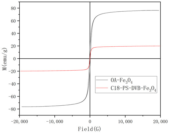 Figure 4 showed the magnetic performance of Fe3O4 and C18−PS−DVB−Fe3O4, which were analyzed by VSM. The magnetic hysteresis loops reflect that the saturation value of Fe3O4 was 62.67 emu/g, and C18−PS−DVB−Fe3O4 was 19.93 emu/g. The saturation magnetization of C18−PS−DVB−Fe3O4 was obviously lower than that of Fe3O4, which was related to the organic polymer layer that coated the Fe3O4 surface effectively. However, it had no remarkable influence on the rapid magnetic separation of the adsorbent from the sample solution. C18−PS−DVB−Fe3O4 can not only be evenly dispersed in a solution without an external magnetic field, but can also be rapidly separated from the solution via a magnet within 10 s.