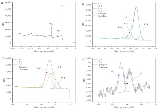 X-ray photoelectron spectroscopy (XPS) analysis (a), the fit of the C1s XPS spectrum (b), the fit of the O1s XPS spectrum (c), the fit of the N1s XPS spectrum (d).