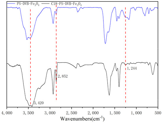 In order to further identify the functional groups on the surface of the synthesized sample, FTIR test was used, as shown in Figure 6. The tensile vibration peak at 3420 cm−1 corresponds to the -OH functional group. The absorption peak at 2852 cm−1 belongs to methylene, and the peak intensity of PS−DVB−Fe3O4 at this position is significantly weaker than that of C18−PS−DVB−Fe3O4, which was mainly due to the rich methylene ((-CH2)17) in N, N-dimethyloctadecylamine. The absorption peak at 1244 cm−1 was the epoxy group, and the peak intensity of PS−DVB−Fe3O4 at this position is significantly stronger than that of C18−PS−DVB−Fe3O4 because the C18 functional group was grafted by the epoxy ring opening reaction. According to the increase in the intensity of the methylene peak and the decrease in the intensity of the epoxy group peak, it was shown that the C18 functional group was successfully grafted.