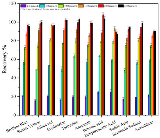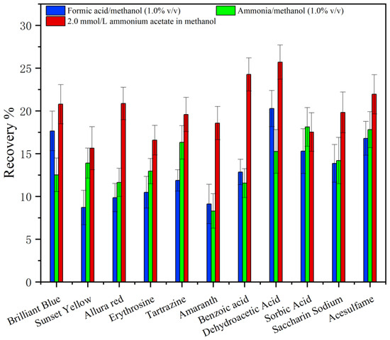 The selection of a suitable elution solvent was an important aspect of improving the extraction efficiency. The ideal elution solvent can completely elute the analyte from the surface of the extraction material. In this study, several solutions of formic acid/methanol (1.0%, v/v), ammonia/methanol (1.0%, v/v), 2.0 mmol/L ammonium acetate in methanol, 5.0 mmol/L ammonium acetate in methanol, 10.0 mmol/L ammonium acetate in methanol, 15.0 mmol/L ammonium acetate in methanol, 20.0 mmol/L ammonium acetate in methanol, and 25.0 mmol/L ammonium acetate in methanol were studied. The results are shown in Figure 7 and Figure 8. The elution effect of the 2.0 mmol/L ammonium acetate–methanol solution was obviously better than formic acid/methanol (1.0%, v/v) and ammonia/methanol (1.0%, v/v). Using 2.0 mmol/L ammonium acetate in methanol, the recoveries of 11 food additives were 15.62–24.3%. The possible reason was that the mixture of ammonium acetate and methanol destroys the electrostatic force between C18−PS−DVB−Fe3O4 and analytes. Compared with the ammonium acetate solution of 2.0 mmol/L, using the ammonium acetate solution of 20.0 mmol/L as the eluent, the elution effect of 11 kinds of food additives was the best, and the recoveries were 89.8–108.0%. It may be explained that the higher the concentration of ammonium acetate, the greater the destruction intensity of the electrostatic force between C18−PS−DVB−Fe3O4 and the analyte.