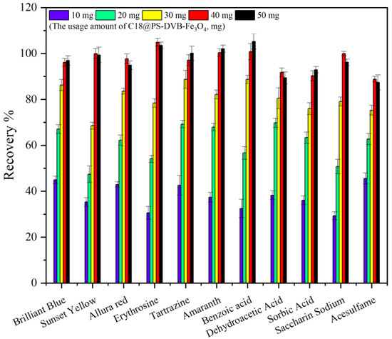 The control of the adsorption dose has a great influence on the adsorption effect of the target substance. If the adsorption dose is too small, the target can not be completely adsorbed, and if the adsorption dose is too much, there will be too many irreversible points on the surface of the adsorbent so that the adsorbed target can not be eluted successfully, thus affecting the elution efficiency. In this paper, adsorbent dosages such as 10 mg, 20 mg, 30 mg, 40 mg, and 50 mg are selected for research. According to the experiment, the recoveries of 11 kinds of food additives were obtained. As shown in Figure 9, the trend of recovery was obvious when the amount of adsorbent was in the range of 10–50 mg. The adsorption effect was best when the amount of adsorbent was 40 mg, and the recoveries of 11 food additives were 88.2–105.2%. When the amount of adsorbent increased to 50 mg, the recovery did not change significantly. Therefore, the adsorbent of 40 mg is the best dosage.