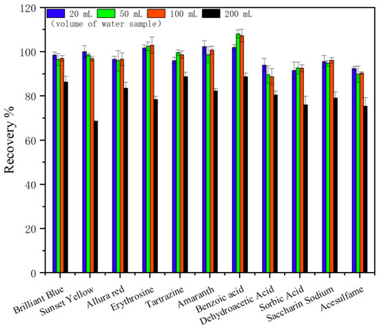 To obtain reliable analytical results and a high enrichment factor, obtaining satisfactory recoveries of the target substance from a large volume of sample solutions is very important. Maximum volumes ranging from 20 mL to 200 mL were studied. Following the experimental procedure, the recoveries of 11 food additives at different volumes were obtained, and the results indicate that the maximum volume was as high as 100 mL with a recovery >88.7% (Figure 11). Therefore, 100 mL of the sample solution was adopted for the preconcentration of 11 food additives from sample solutions. A high enrichment factor of 100 times was obtained because the final elute solution was 1.0 mL in these experiments.