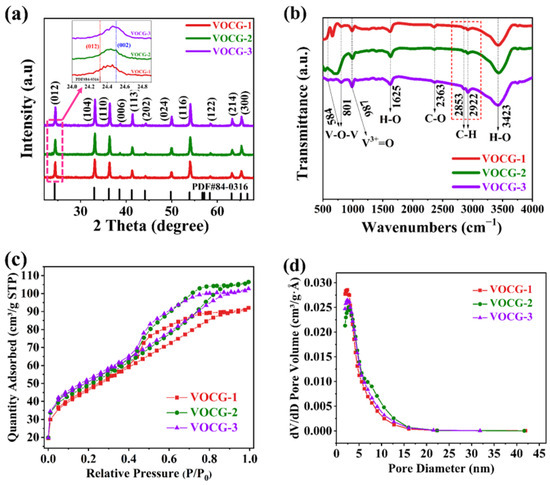 (a) XRD patterns; (b) FT-IR spectrum; (c) N2 absorption/desorption isotherms; and (d) pore size distribution of the V2O3@CGL composites. Inset images show the (012) and (002) diffraction planes of the V2O3@CGL composites.