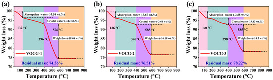 TGA curves of (a) VOCG-1, (b) VOCG-2, and (c) VOCG-3 composites.