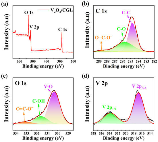 (a) XPS survey spectra; at high-resolution: (b) C 1s, (c) O 1s, and (d) V 2p XPS spectra of the V2O3@CGL composites.