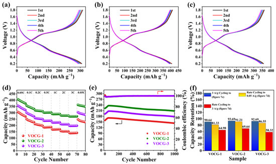 GCD profiles of (a) VOCG-1, (b) VOCG-2, and (c) VOCG-3 composites in the original five cycles; (d) rate; (e) cycling properties; and (f) capacity retention after 1000 cycles at 3 A g−1 (blue), capacity retention after rate cycling to 3 A g−1 (yellow) and rate cycling back to 0.05 A g−1 (red) of the three samples.