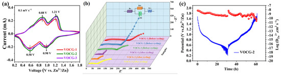 The CV curves were utilized to evaluate the electrochemical process kinetics of the V2O3@CGL electrode within the range 0.2–1.8 V, as depicted in Figure 8a. The three CV curves possess similar shapes, with two pairs of distinct coupled REDOX peaks placed at about 0.58/0.88 V and 0.98/1.21 V, respectively, indicating that the insertion of Zn2+ in the V2O3@CGL electrode undergoes a two-step reversible reaction, akin to the previously reported vanadium-based cathodes [6,16,34]. It has been reported that the area and current depicted in the CV curve are closely linked to the obtained capacity [44]. It is easily observed that the area of the VOCG-2 electrode is the largest, while the VOCG-1 electrode has the smallest area. Consequently, the VOCG-2 electrode has the largest specific capacity among them, while the VOCG-1 capacity is relatively lower.
