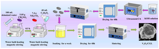 The detailed synthesis procedure for the V2O3@CGL composites is displayed in Figure 10. Firstly, 5.05 g CH4NO2 and 7.4 g NH4VO3 were dissolved in 100 mL of distilled water, followed by stirring in a water bath at 60 °C for 0.5 h. Subsequently, 40 mL of C2H6O2 solution and 0.3 g of CGL were mixed into the above solution, sealed, and left for a week. In order to completely evaporate the water, the mixture was dried in an oven at 80 °C for 48 h. The final stage of the process involved the transfer of the resulting precursors to a corundum crucible and their placement in a tubular furnace. Subsequently, the furnace was heated to 350 °C for 4 h and then heated to 800 °C for 8 h at a rate of 5 °C min−1 in an argon environment. This procedure yielded the desired VOCG-3 composite. The mass ratio of NH4VO3 to chestnut needle was adjusted in order to prepare the VOCG-1 and VOCG-2 composites by the same method. Table 4 illustrates the quality of the raw materials produced for each sample.