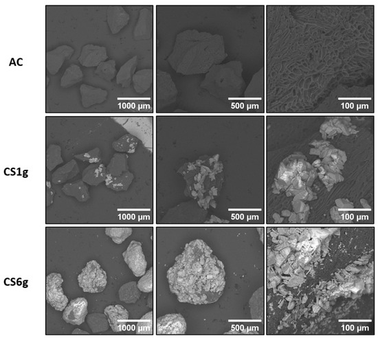 The results shown in Table 1 reveal that the presence of α-FOD with a specific surface previously reported to be between 20 and 30 m2·g−1 [37] did not drastically affect the specific surface area of the AC. Several reports have shown that the addition of a photocatalyst with a relatively low surface area onto the AC surface can decrease the composite specific surface area value [8,24,47]. This can be attributed to the partial clogging of the active sites of the carbon by the photocatalyst particles, as observed in this work for composite CS6g, which is evidenced as well in the SEM images. Interestingly, for composite CS1g, the specific surface area is slightly higher than that of pure AC. This behavior has been reported by other authors [21,48] and can be explained by a slight modification of the meso/microtexture of the AC porous network during the treatment (acid hydrothermal process). For instance, AC derived from date stone and TiO2/BiOBr/Bi2S3/AC composites synthesized by Alikhani et al. [48] presented surface areas of 415 and 659 m2·g−1, respectively, which are comparable to the values reported in this study. Regarding the pore diameter, the results show a microporous structure for the AC, which is slightly increased by the addition of α-FOD, due to the partial blocking of the AC micropores [6].