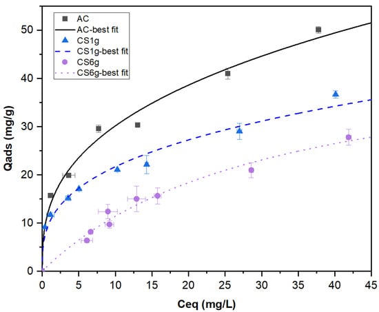 Phenol adsorption isotherms were constructed for the AC and the composites. The experimental results of the adsorption capacity at equilibrium (Qads) vs. equilibrium concentration of phenol (Ceq) were plotted and fitted to the nonlinear Langmuir (Equation (1)) and Freundlich (Equation (2)) models [49], which are the most commonly used expressions to describe the adsorption phenomenon.