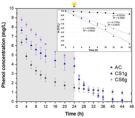 Phenol adsorption under dark conditions (first 24 h) and photocatalytic degradation under visible light (last 24 h) by using AC (■), and composites obtained from the dissolution of 1 g (▲) and 6 g (⬤) of precursor. Adsorbent dosage: 0.5 g/L. Inset: First-order kinetic equations of the photocatalytic degradation of phenol calculated with the first 16 h of visible irradiation.