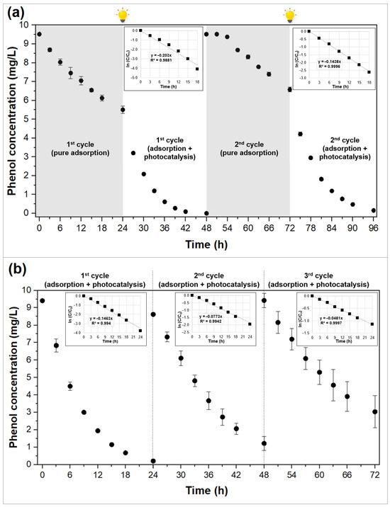 The results of the second regeneration experiment are displayed in Figure 5b. In this case, the three cycles correspond to tests under visible light irradiation, which means that adsorption and photocatalysis took place at the same time from the very beginning of the tests. As presented in Figure 5b, the removal efficiency of phenol declines from 97.7% in the first cycle to 85.8% in the second and 67.8% in the third cycle.