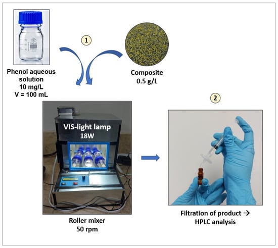 To study the adsorption and photocatalytic performance of the AC and the synthesized composites, a 48 h batch test was conducted. Thus, 100 mL of phenol solution with an initial concentration of 10 mg/L was placed into a transparent borosilicate bottle with 0.05 g of AC or composite. The experiment was conducted in the roller mixer, with the first 24 h of the experiment under dark conditions and the following 24 h under visible light exposition (Sylvania, LED panel SQ 18WDL, Shanghai, China) to show the adsorption and photocatalytic activity of the materials, respectively.