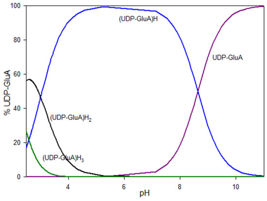 The analysis of the potentiometric studies confirmed the presence of three protonated forms of the ligand, (UDP-GluA)H, (UDP-GluA)H2, and (UDP-GluA)H3, in the system studied. The protonation constants of these forms and their formation reactions are given in Table 1. The structural formula of the studied ligand with a highlighted potential coordination site is shown in Figure 1.